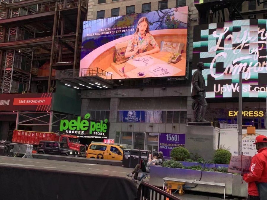 “能够登上纽约时代广场大屏,得益于多方面的支持与帮助,但我的内心还是很激动的,也更加意识到,传播中国文化、增强文化自信,我们任重而道远。”韩笑说。