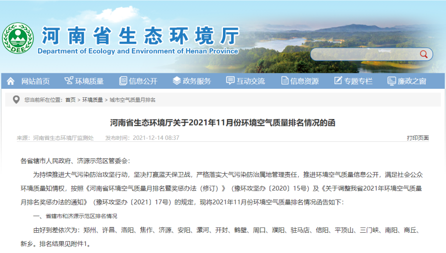 12月14日,正观新闻记者从河南省生态环境厅获悉,2021年11月份全省环境空气质量排名情况已经公布。