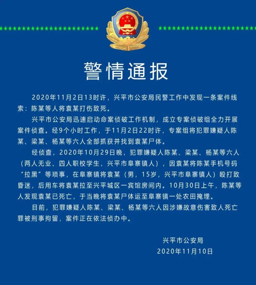 11月10日下午,兴平市公安局通过其官方微博发布警情通报:10月29日晚,6名嫌犯因袁某将其中一人电话“拉黑”等琐事,在阜寨镇将袁某殴打致昏迷,后用车将其拉至城区一宾馆。10月30日上午,6名嫌犯发现袁某已死亡,于当晚将其尸体运至一处农田掩埋。