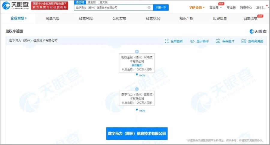 数字马力(郑州)信息技术有限公司的法定代表人为余滨,注册资本1000万人民币,经营范围包括技术推广;企业管理咨询;社会经济咨询服务;软件销售等。股权穿透图显示,该公司由蚂蚁金服(杭州)网络技术有限公司间接全资控股。