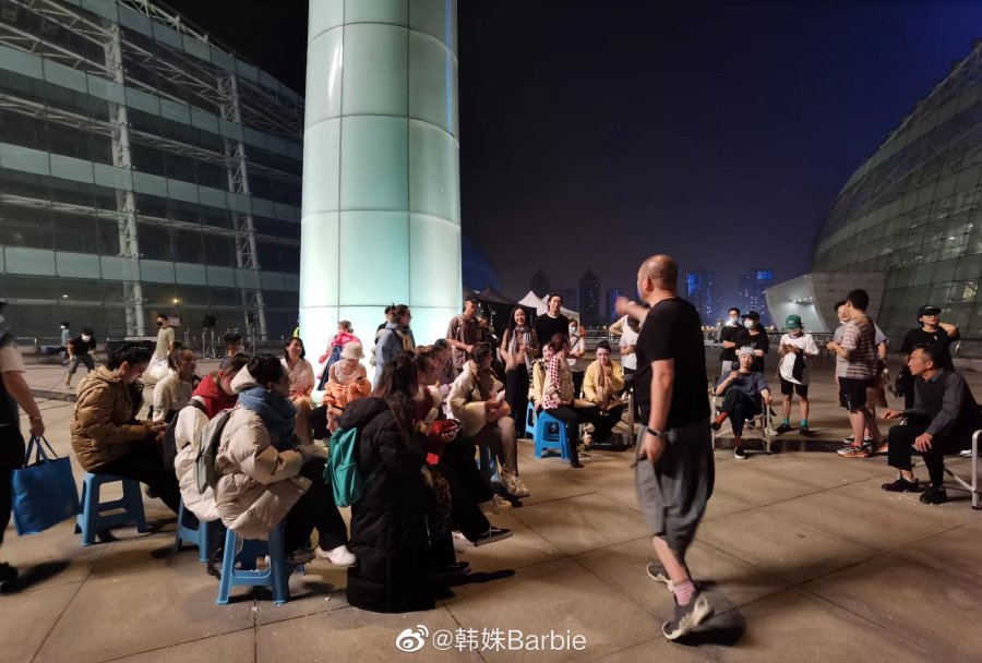 演员们穿着羽绒服拍摄,图源郑州歌舞剧院演员@韩姝Barbie