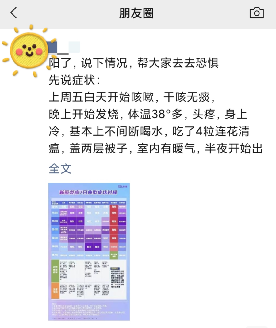 “今天是感染新冠第三天,已经退烧”“阳了,和大家说说这几天的经历”“一周转阴!我都用了哪些方法”……近期,越来越多感染新冠病毒的人都在朋友圈、微博、小红书等平台上分享自己患病的经历,老人、儿童、孕妇等特殊人群的各种科普和分享案例也在纷纷刷屏。