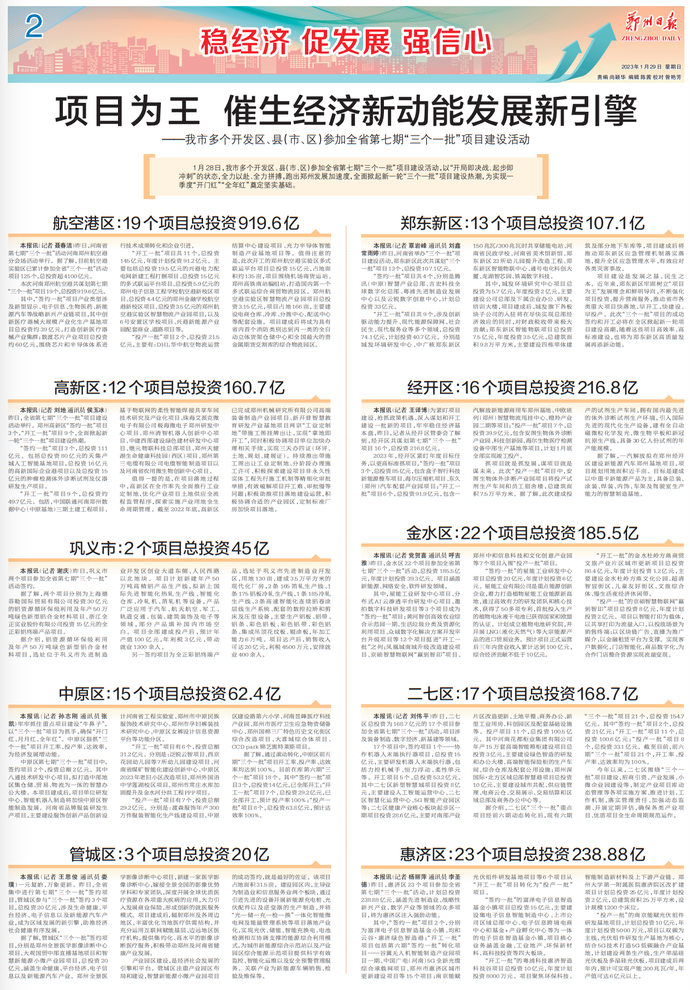 2023年,经开区紧盯年度目标任务,以更高标准抓项目,“签约一批”项目3个,总投资85亿元,包含盒子智行科技新能源整车项目、海尔压缩机项目、东久(郑州)汽车配套产业园项目;“开工一批”项目6个,总投资91.9亿元,包含一汽解放新能源商用车郑州基地、中欧班列(郑州)智慧物流甩挂中心、瞪羚产业园二期等项目;“投产一批”项目7个,总投资39.9亿元,包含安图生物体外诊断产业园、科技创新园、海尔生物医疗检测设备中部生产基地等项目,计划1月底全部实现竣工投产。