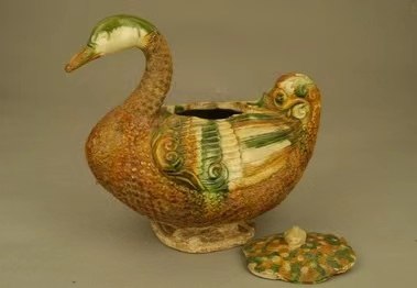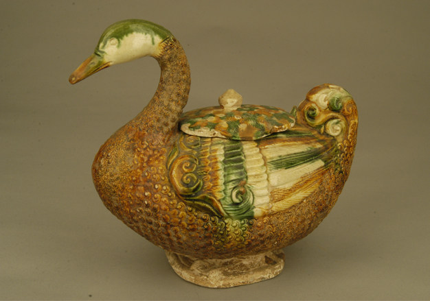 这件三彩鸳鸯盉造型生动,釉色斑驳绚烂,是三彩工艺与实用品相结合的典型器,具有较高的文物收藏价值和艺术价值。由于器盖的存在和脖颈处细长的形态,此类器具保存起来难度较大,但这件三彩鸳鸯盉几乎没有损坏,非常难得。除此件外,目前仅在河南洛阳新安县发现过类似器具。