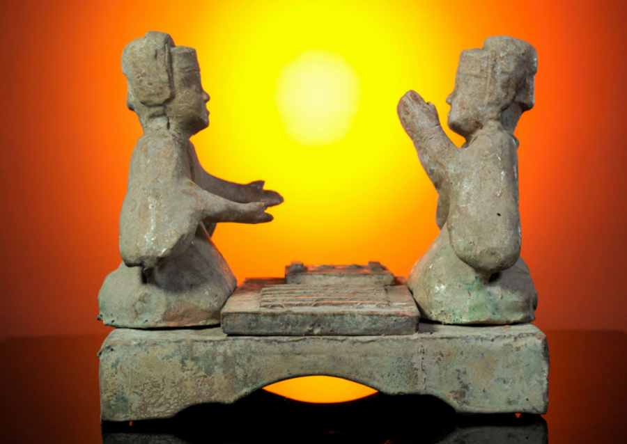 跽坐于陶榻两端的人俑,正兴致勃勃地投箸行棋。一人双手向上前举,似在拍手叫好;另一人两手摊开,或在表示辞让。栩栩如生的神态,勾勒出时人面对一次次偶然胜负的散漫与疏放,也让我们对消散在历史中的六博游戏心向神往。