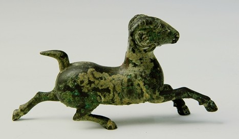 铜奔羊,铜器,汉代文物,长14厘米,高7厘米。1974年河南洛阳偃师寇店出土,现藏河南博物院。体表大部分呈黑褐色,部分地方褐色斑状较为明显,并且两侧有少量的铜锈。