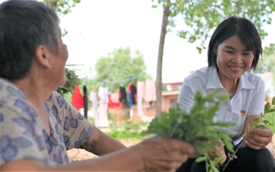 张庭莲(右)与村民聊家常