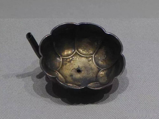 这件现藏于陕西历史博物馆的鎏金莲花形银灯头,是唐时期创作的历史文物,也是迄今为止发现的时代最早的碧筒杯。其上分布着根根分明的茎叶脉络,容器底部正中开一小口,连着一旁的茎管,让人能饮、能看,也能赏。