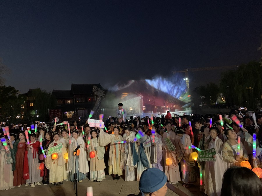 套上立领对襟衫,系上刺绣马面裙,搭上方领对襟袄,身着一身华丽汉服,手提一盏宫灯,腰间一把团扇,或三两相伴,或漫步在古色古香的街巷中,游客仿佛重新步入盛唐的坊市之中。