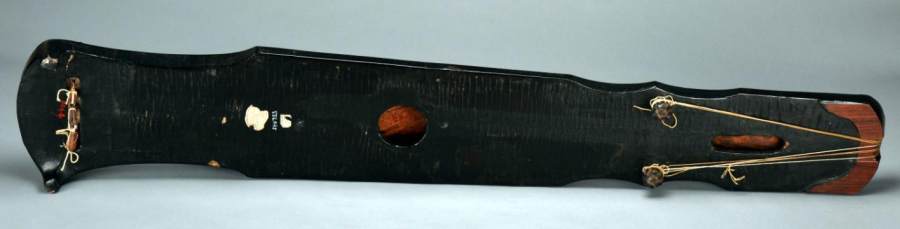 伏羲式古琴,木器漆,宋代文物,伏羲式,通长123.0厘米、宽20.5厘米。现藏河南博物院。琴体匀称厚重,琴面弧度较大,琴底弧度较平,琴体边棱较为明显、没有做圆迹象。