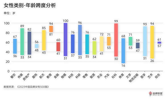 图:《TopBrand 2023中国品牌女性500强》各类别年龄跨度情况