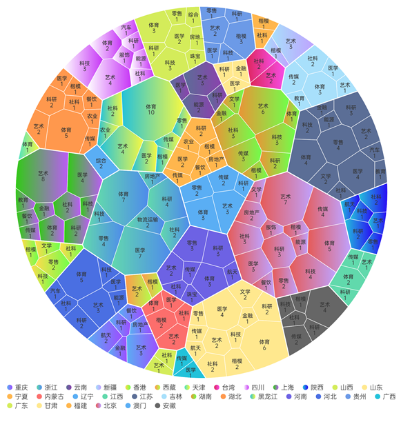 从各地区类别来看,地区类别特点鲜明。2023年中国品牌女性中,黑龙江更易出现体育类别的品牌女性,共10名体育品牌女性入选;上海更易出现艺术类别的品牌女性,共有8名艺术品牌女性入选;浙江更易出现医学类别的品牌女性,共7名医学品牌女性入选。