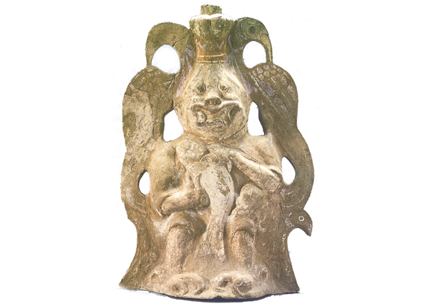 灰陶材质,由模制和捏塑而成,上施彩绘。神人正坐,头戴花冠,冠顶似蒜头状,冠正中有短圆柱,中空,似做插物之用。神人身躯呈人体状,手脚均作鸟爪状,双手紧抱一鱼,贴于胸前。鱼身残有白彩。神人两侧对称各塑二鸟,上部二鸟各立于神人左右肩上,脖颈系绶带,鸟翅部分绘有紫、白彩绘,长尾饰以白色长线条,下垂与下部鸟首相接。