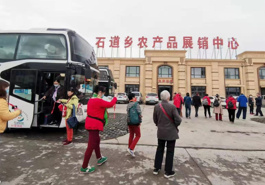 在赵庄村的农产品展销中心大门口,几辆旅游大巴整齐排列,游客们正在展销大厅里进行选购,“这段时间来附近游玩的人多得很,大部分都会路过我们这儿进行一个集散,再去往嵩山、洛阳、少林寺游玩。”石道乡农产品展销中心负责人王帅满面笑容,“今年我们公司要做到把游客‘引进来’,让农产品‘走出去’,带动群众‘富起来’。”