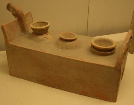 两汉时期是我国有封闭燃烧室和固定烟道的炊具——灶的出现和定型阶段。西汉中前期的陶灶,形制相对较为简单,多有1个火眼,在墓葬中出土数量不多。到了西汉晚期,灶面火眼开始增加到2至3个,灶面也开始出现了模印食品和厨房用具,并在灶面边缘和侧面出现刻划图案,使陶灶更具有装饰艺术性。