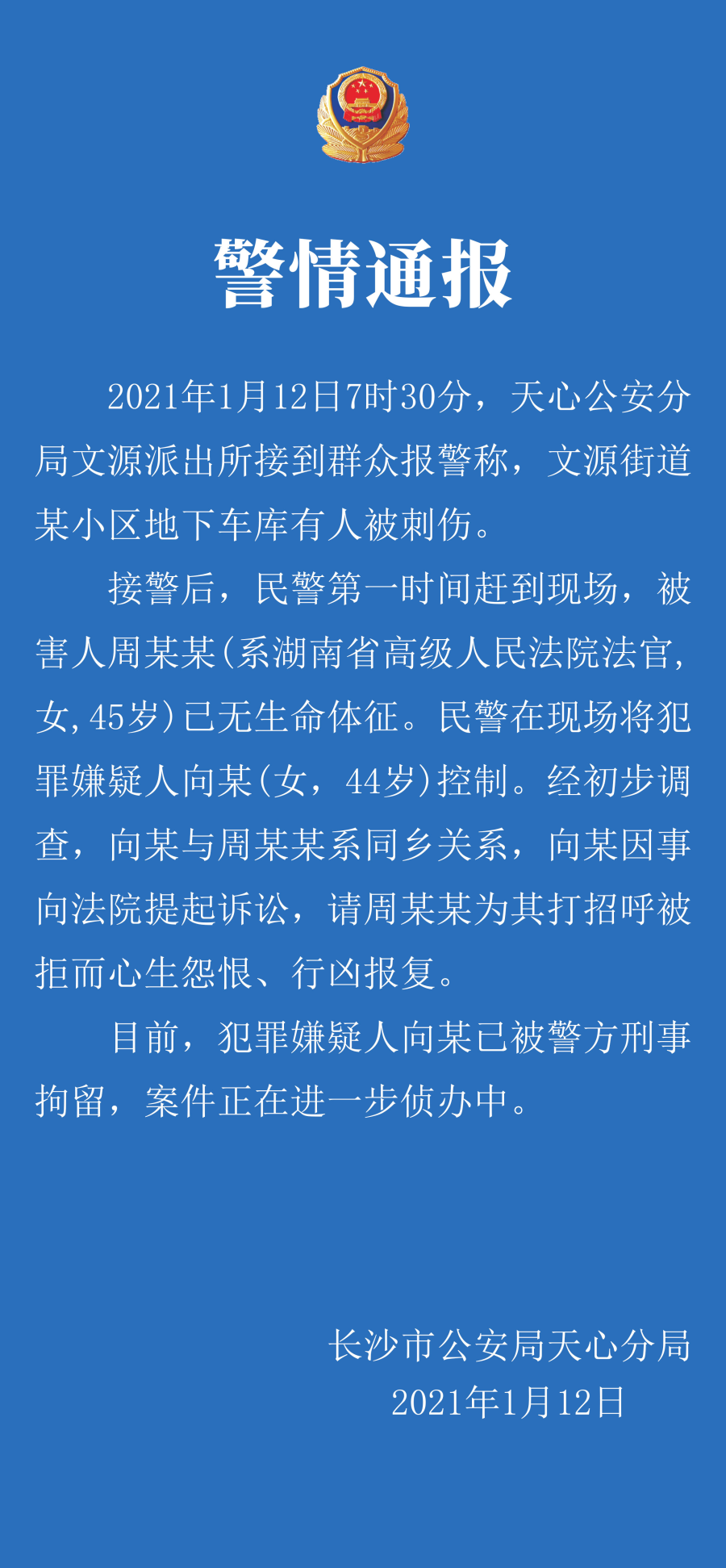 据湖南省长沙市公安局天心分局官方微博@天心警事发布的警情通报,2021年1月12日7时30分,湖南省长沙市文源街道某小区地下车库有人被刺伤。民警到场后发现,被害人周某某(系湖南省高院法官,女,45岁)已无生命体征。民警在现场将犯罪嫌疑人向某(女,44岁)控制。经初步调查,向某与周某某系同乡关系,向某因事向法院提起诉讼,请周某某为其打招呼被拒而心生怨恨、行凶报复。目前,犯罪嫌疑人向某已被警方刑事拘留,案件正在进一步侦办中。