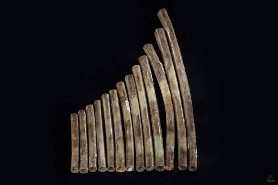骨排箫,骨质,西周初期音乐文物,由13根长短递减的禽类腿骨制成,最长管32.7厘米,最短管11.8厘米,1997年河南省鹿邑太清宫长子口墓出土,现藏于河南博物院。