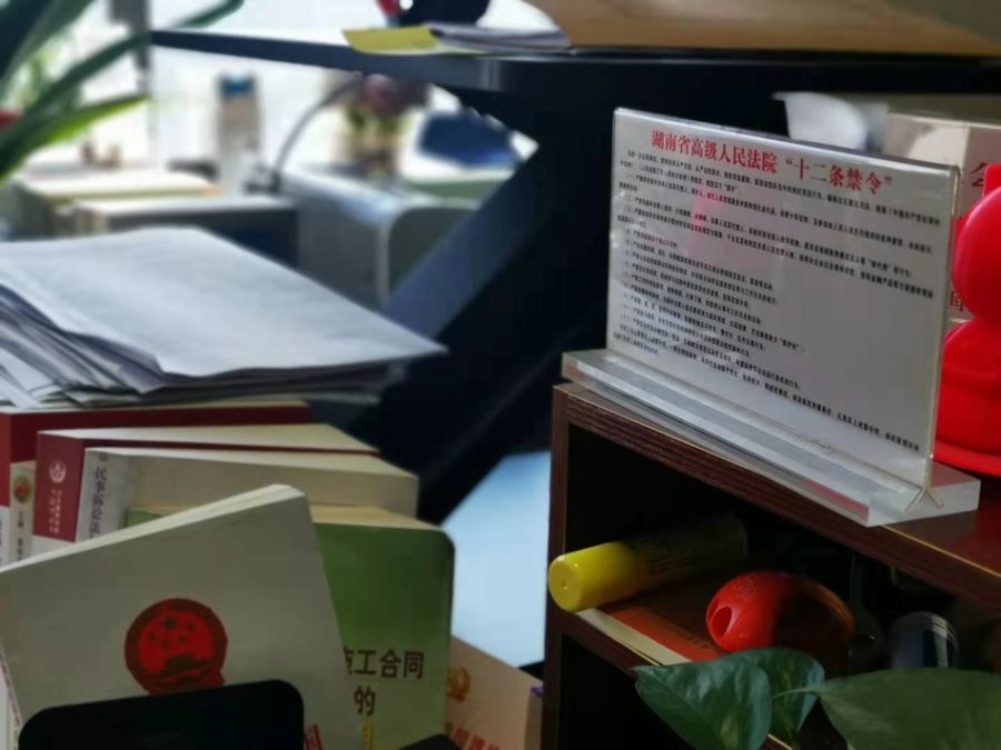 周春梅的办公桌上立着醒目的《湖南省高级人民法院“十二条禁令”》。