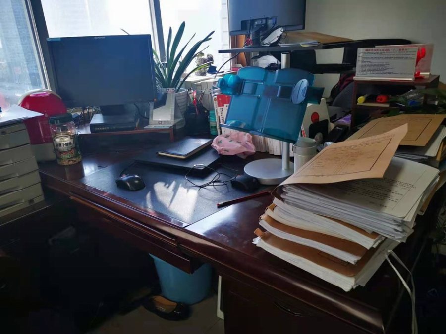 周春梅的办公桌上垒放着待办理的案件。