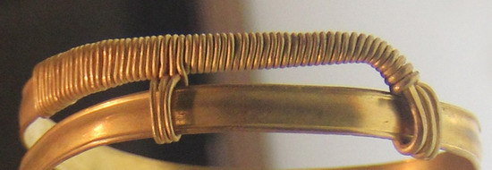 河南博物院馆藏的这对金臂钏,主要采用铸造、捶揲、花丝等工艺技法制成,器形和制法相同,大小相近,可成对使用。钏体为薄扁形,盘绕旋转成螺旋式的弹簧状,共九个相连的圆圈组成一器,可自由伸缩。首尾两圈的端处逐渐变细,各用“花丝工艺”中的“祥丝法”缠细金丝形成间距均匀紧密的丝纹,并以金丝分别折回缠绕固定在下一个环圈上,各分两处,每处三道,接口处能左右滑动,可根据手臂的粗细调节开口大小和松紧。