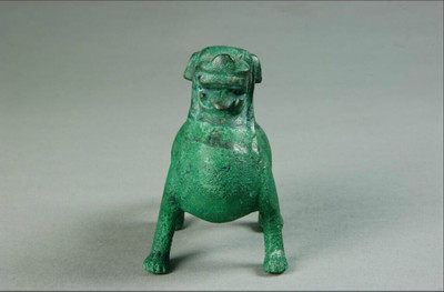 天禄昂首挺胸呈站立状,两耳下垂,两眼珠外突,大鼻,张口吐舌,宽尾下拖,兽足,头部和尾部可见阴刻细线纹饰做毛发,宽尾下拖,且背部有一柱状圆孔与腹腔相通。通体呈孔雀绿色,如同一层绿色油漆,金属光泽度好。