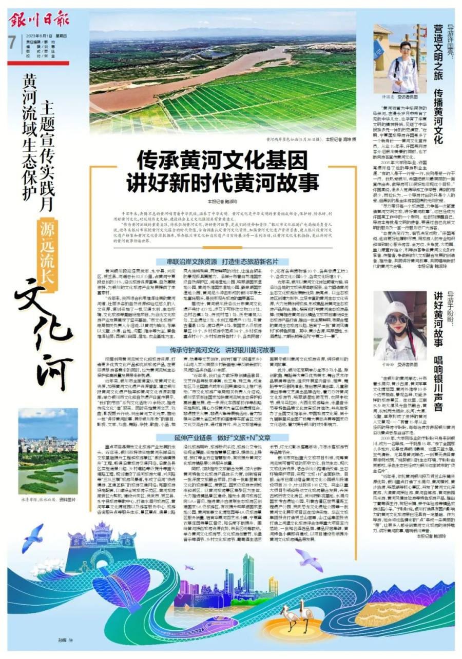 “作为黄河流域的重要省区,传承弘扬黄河文化,讲好黄河故事,是我们的使命和责任。”银川市文化旅游广电局相关负责人说,近年来银川市深挖黄河文化蕴含的时代价值,全面调查认定黄河文化资源,加强黄河文化遗产资源普查,建立银川段黄河文化遗产档案和黄河文化资源数据库,举办银川市文化和自然遗产日宣传展示等一系列活动,让黄河文化生机勃勃,更让新时代的黄河故事传遍世界。