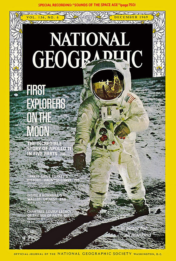 比如1969年12月的杂志封面“首批登月探险家”,画面上是奥尔德林在月球表面行走,由阿姆斯特朗拍摄,这也是人类太空探索史上迄今最重要的照片之一。