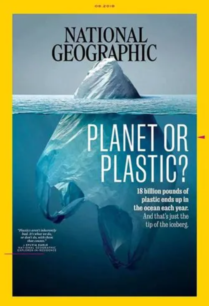 2018年6月,这期的《国家地理》杂志将塑料污染以一种冰冷震撼的方式展示给了人们。这张封面图的海面上乍看像冰山一角,但海水中被掩盖着的却是白色塑料袋。