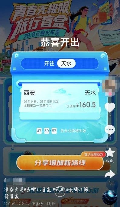“准备出发,来一场说走就走的旅行。”六月中旬,就读于西北大学的00后小萌在朋友圈晒出了自己开“旅行盲盒”的视频,“这个盲盒活动只要28.8元,我抽中了价值约160.5元的‘西安-天水’单程火车票,正好趁着暑假出去旅游,非常开心。”
