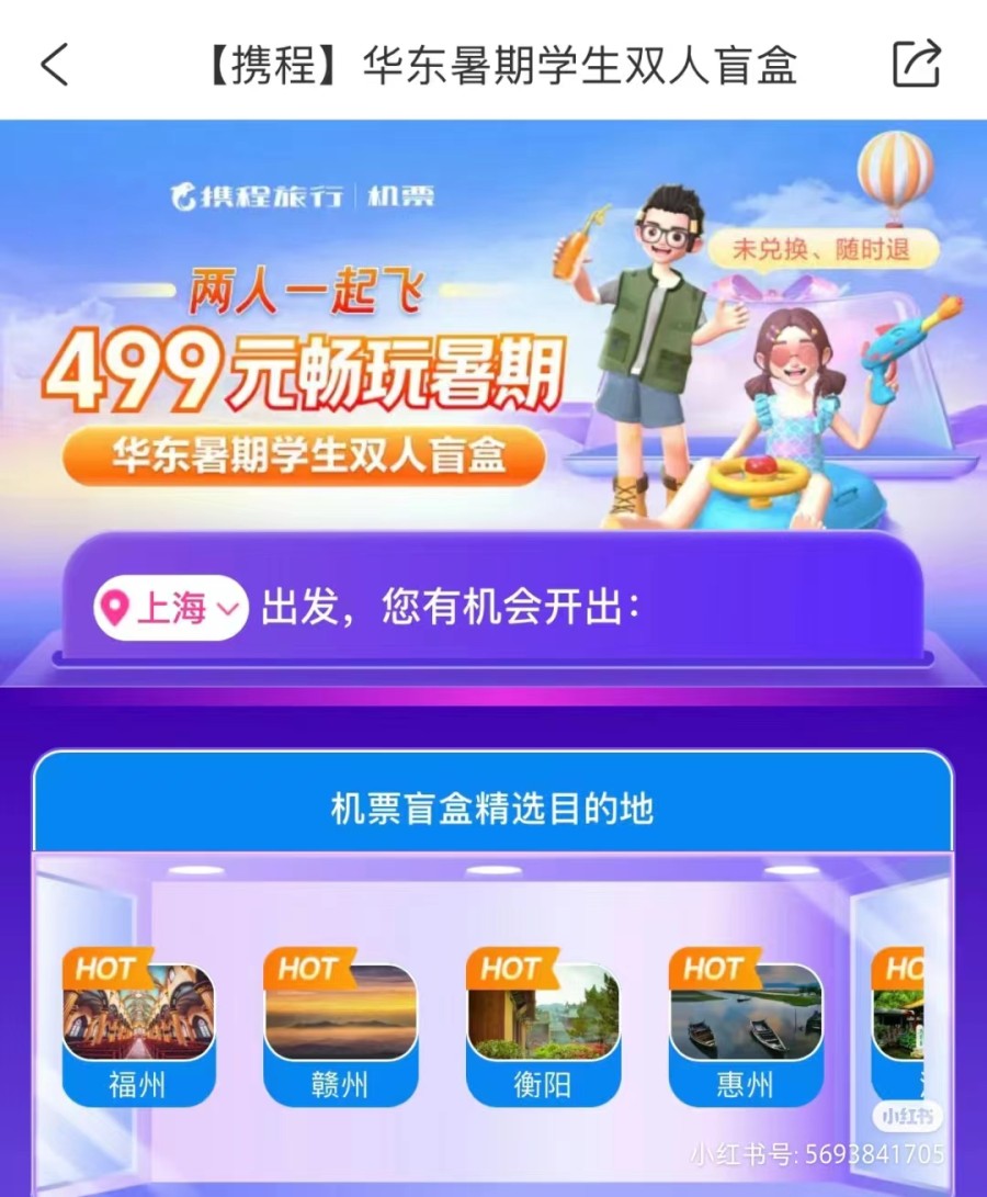 近期,随着暑期已至,不少在线旅行平台开始为暑期营销造势。记者搜索发现:7月携程推出全国多地出发的华东暑假学生双人机票盲盒,满足暑期放假学生“搭子旅行”需求;同程旅行推出196元单程机票盲盒,打出“不喜欢,全额退”的口号;去哪儿旅行暑期盲盒活动中设置“每日锦鲤奖”、“终日锦鲤奖”激励用户分享活动相关内容,实现活动扩圈、流量积累。