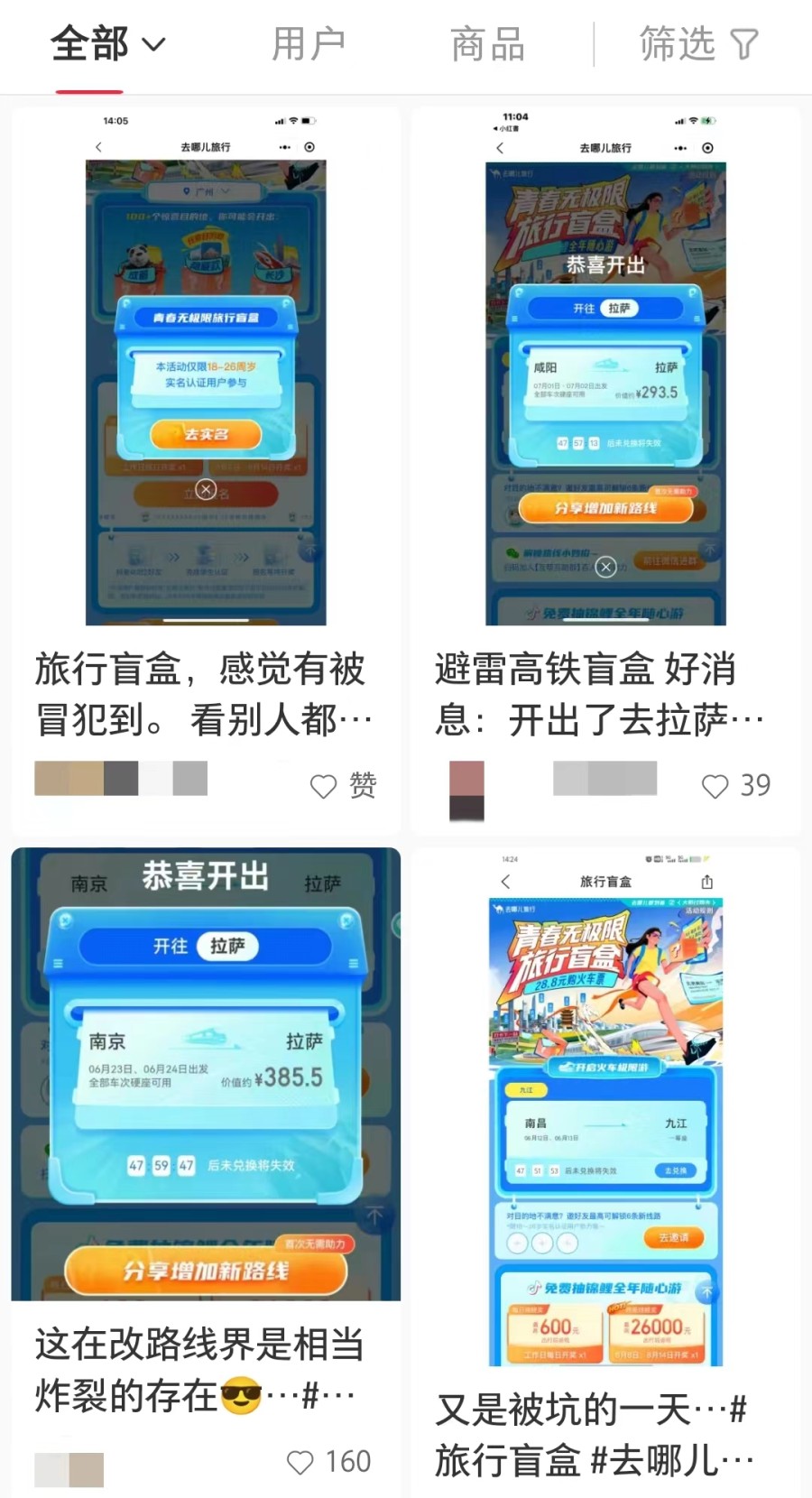 不只是小萌,凭借着超低价、不确定目的地等特点,“旅行盲盒”颇受年轻人追捧,在各大社交媒体平台,随处可见参与者“旅行盲盒”的晒照:花两三杯奶茶的价钱,就能买到出发到任意城市的单程车票,“说走就走”的浪漫一度引得一众消费者热情追捧。