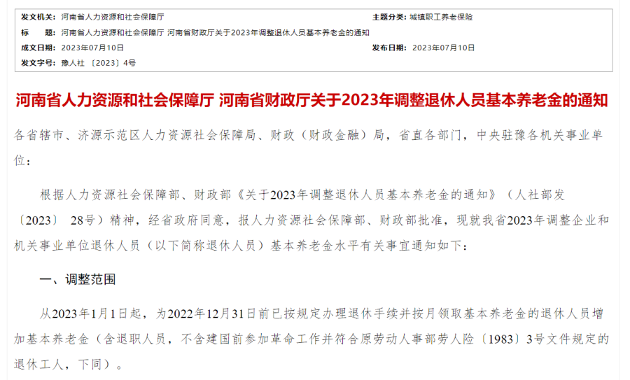 河南退休人员基本养老金再次上涨。日前,省人社厅、财政厅联合印发《关于2023年调整退休人员基本养老金的通知》(以下简称《通知》)。据悉,今年是自2005年以来连续第19年调整企业退休人员基本养老金。