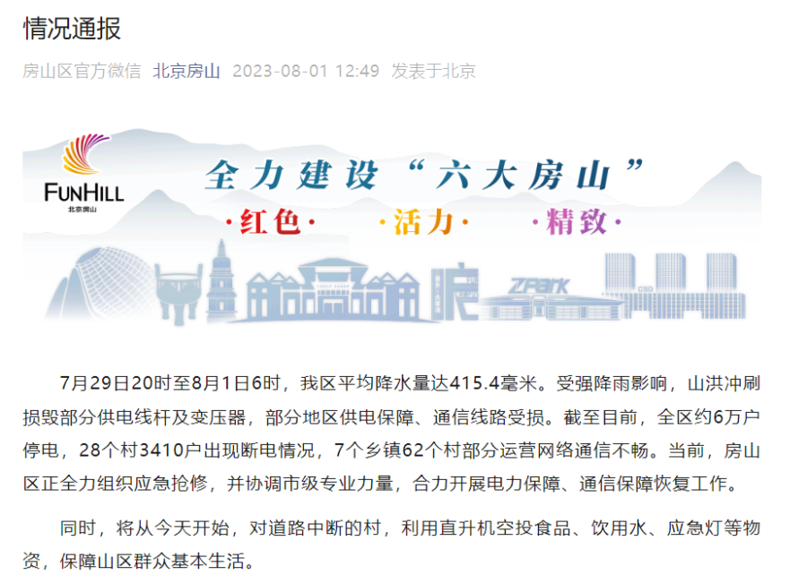 据北京房山微信公众号消息,7月29日20时至8月1日6时,我区平均降水量达415.4毫米。受强降雨影响,山洪冲刷损毁部分供电线杆及变压器,部分地区供电保障、通信线路受损。截至目前,全区约6万户停电,28个村3410户出现断电情况,7个乡镇62个村部分运营网络通信不畅。当前,房山区正全力组织应急抢修,并协调市级专业力量,合力开展电力保障、通信保障恢复工作。