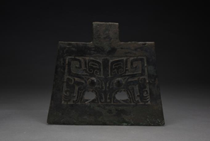 这件兽面纹青铜钺整体呈梯形,刃和阑部平直,阑内两侧各有一长方形穿,用来穿绳固定在长柄上。纹饰的四面共有11个连接点,铸造工艺精巧纯熟。