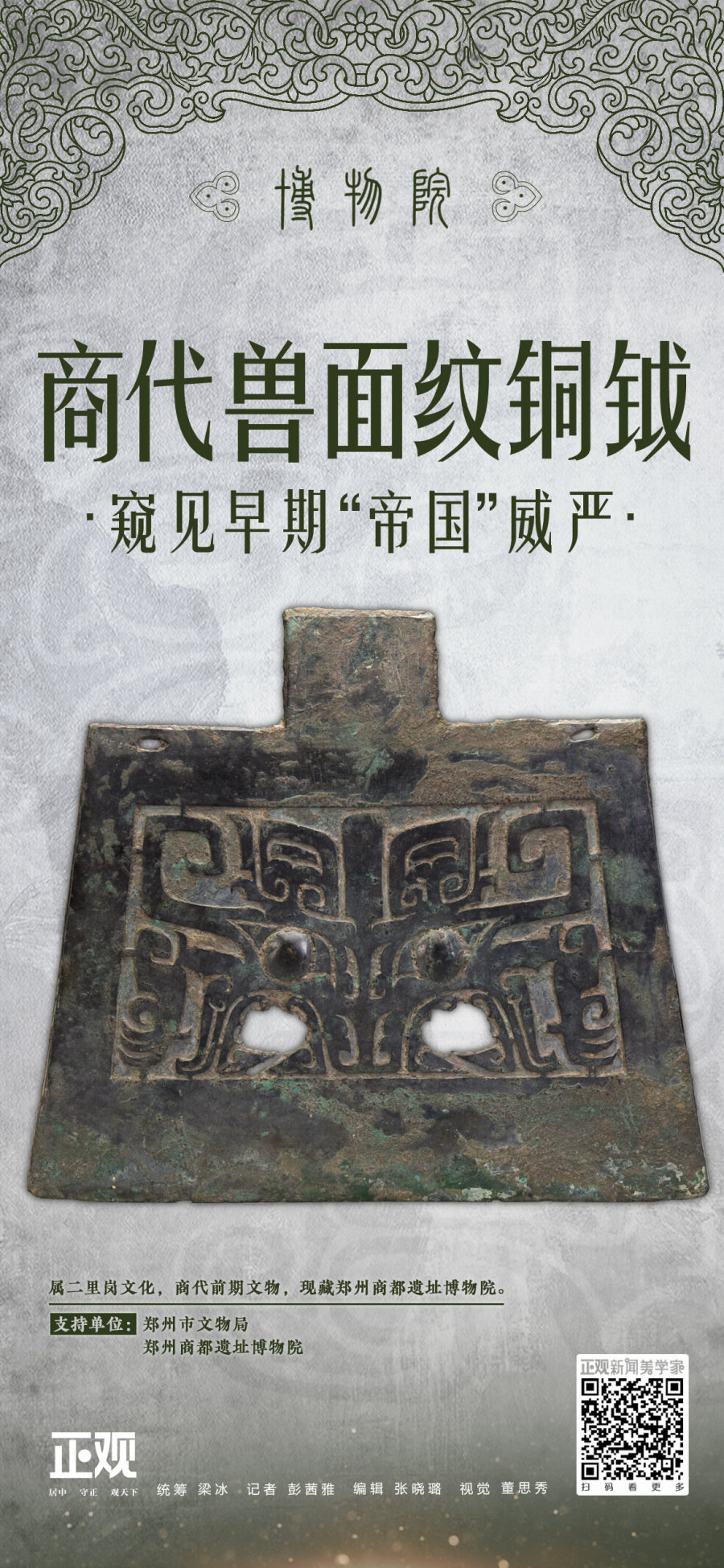 郑州商都遗址博物院收藏的这件兽面纹青铜钺,器形巨大、气势恢宏,在目前出土的商代铜钺中,其体量之大仅次于妇好墓的铜钺,早期“帝国”的威严可窥一斑。(正观新闻记者 彭茜雅)