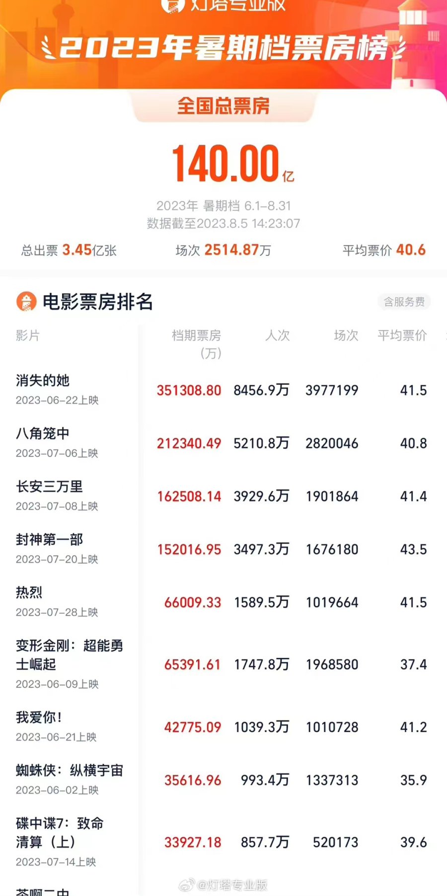 据灯塔专业版实时数据,截至8月5日14时23分,2023年暑期档(6月1日-8月31日)总票房(含预售)已突破140亿!《消失的她》《八角笼中》《长安三万里》位列当前2023暑期档影片票房前三。