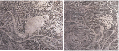 葡萄纹饰枝繁叶茂,果实累累,葡萄串表现的是丰收景象,寓意多子多福,葡萄缠枝纹结构连绵不断,具有生生不息之意。姿态丰腴的海狸鼠与八只飞禽共处其中,使得画面生机盎然、极富动感,和谐美好。
