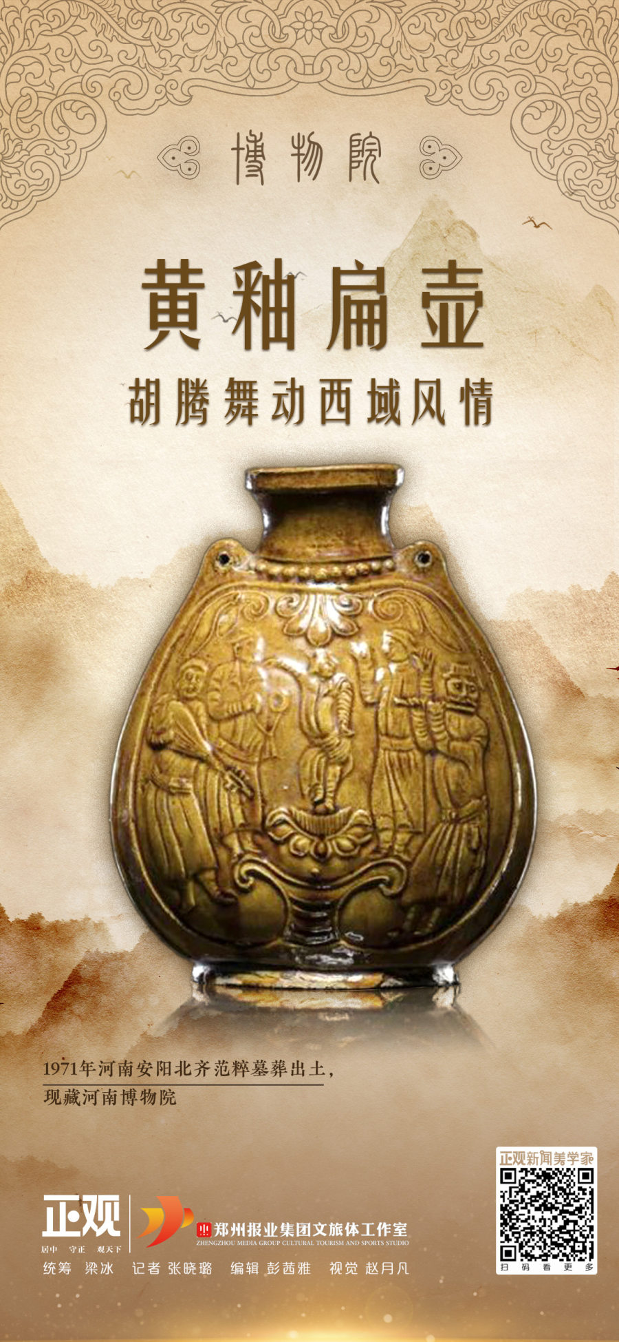 河南博物院馆藏有一件出土自北齐高级将领范粹墓葬的黄釉扁壶,以壶身模印的图案,直观表现了千年前胡腾舞的乐舞场面。