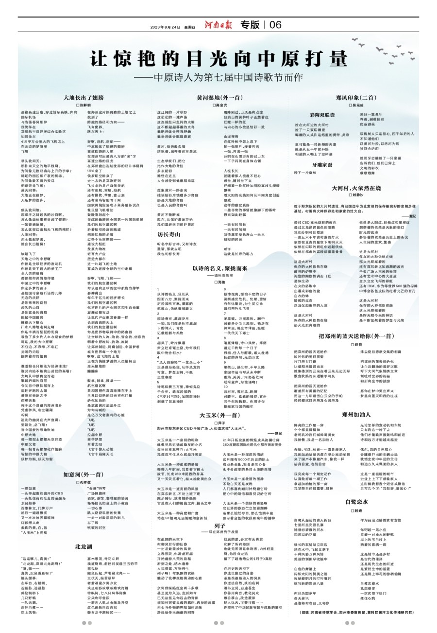 这次在河南日报推出的“让惊艳的目光向中原打量——中原诗人为第七届中国诗歌节而作”诗歌作品专版,共刊发河南著名诗人张鲜明、高金光、孔祥敬、海盈、吴元成、萍子、刘静沙、纪哲、阿娉等最新创作的十余首优秀诗歌作品,反映内容涉及中原优秀历史文化传承、经济社会发展成就和城市建设形象风貌、生态文明建设成果及一线劳动者风采等。