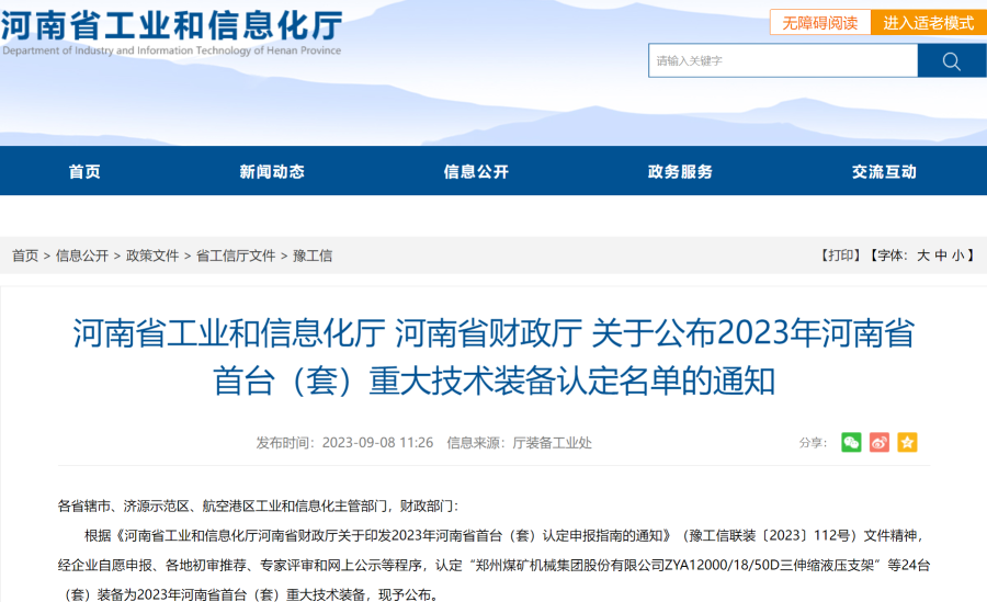 9月8日,河南省工业和信息化厅、河南省财政厅发布通知,认定“郑州煤矿机械集团股份有限公司ZYA12000/18/50D三伸缩液压支架”等24台(套)装备为2023年河南省首台(套)重大技术装备。