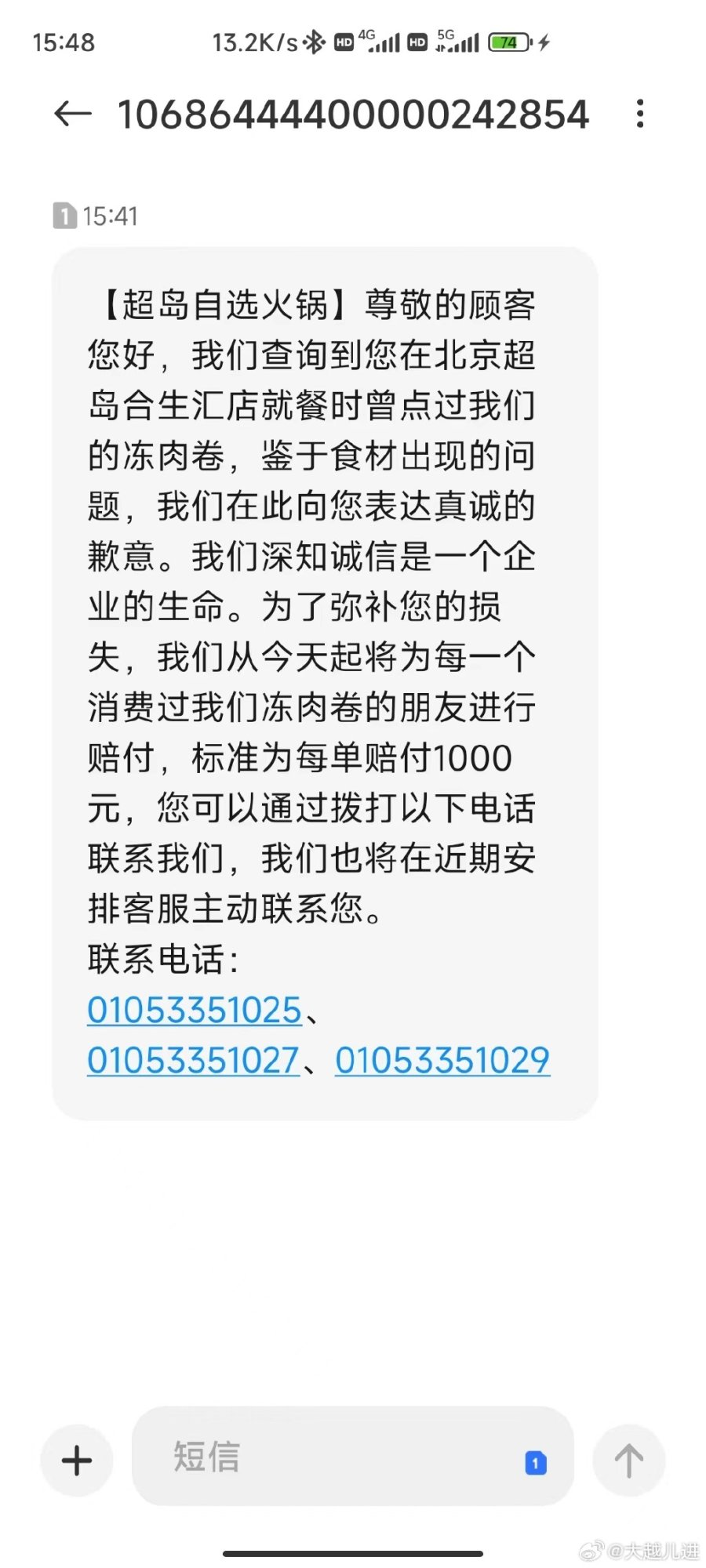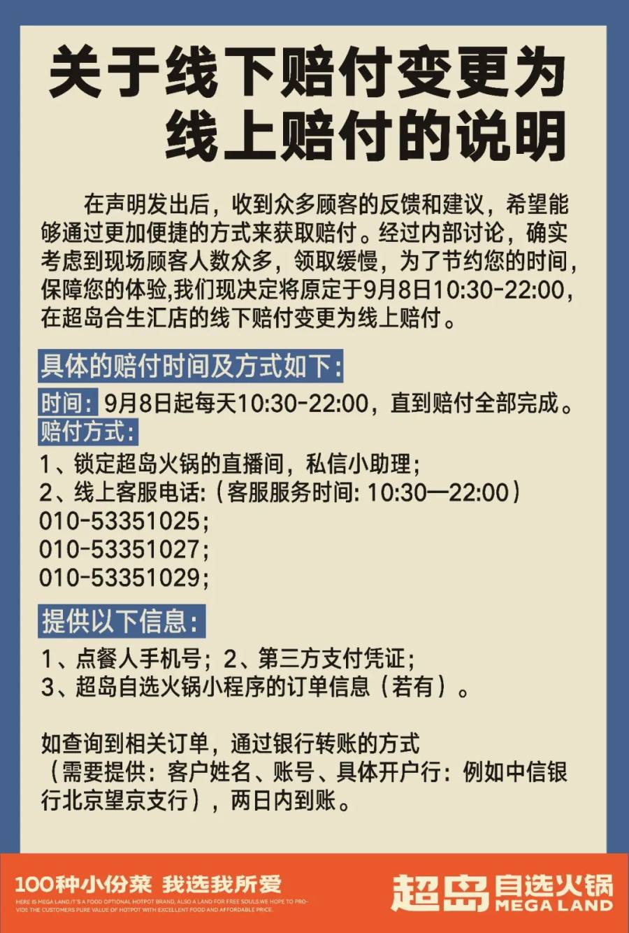 公告称,在超岛合生汇店(其他三家店铺因未销售过涉事产品,故而不参与赔付)消费过问题产品“高钙羊肉”的顾客,可以关注“超岛自选火锅”直播间,私信小助理,等待回复登记信息后打款赔付。