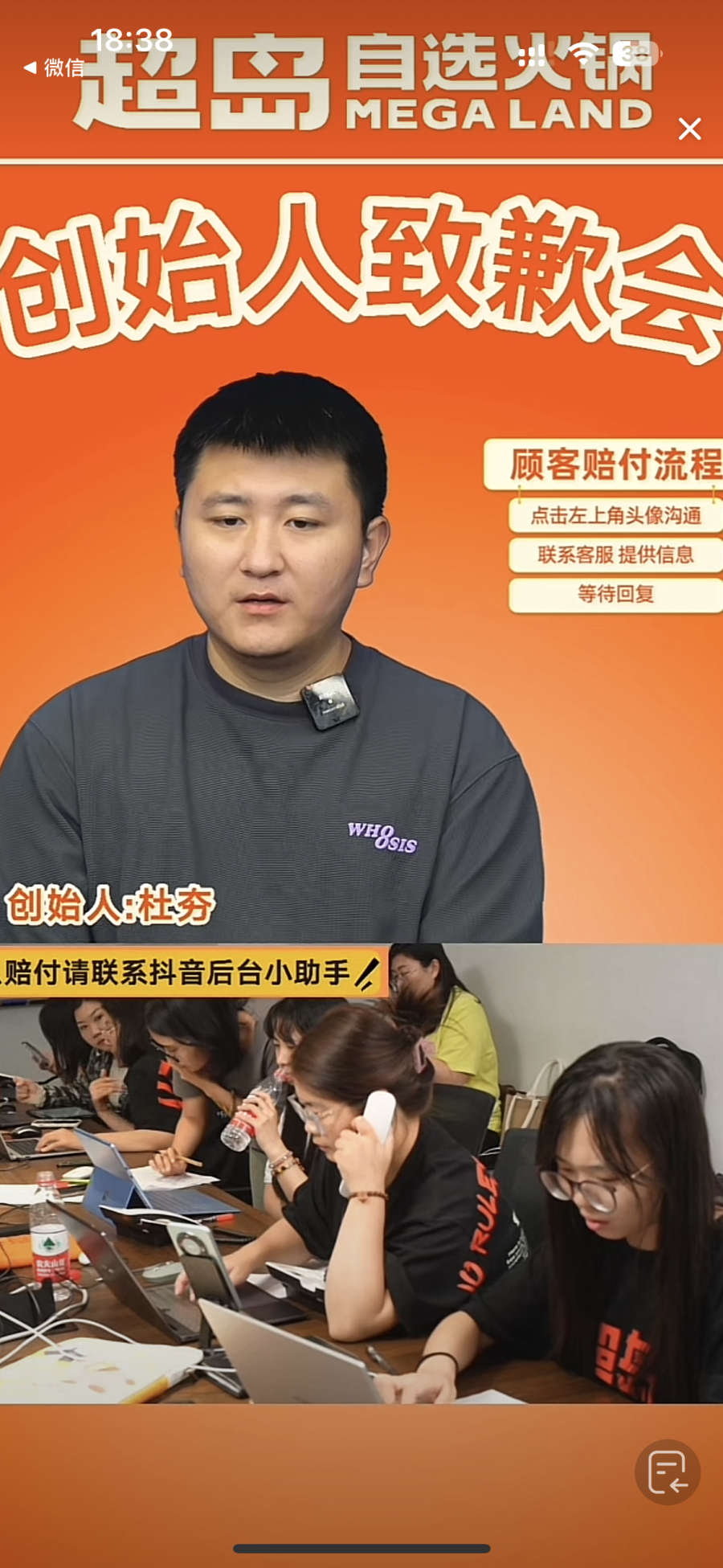 随后,记者在“超岛自选火锅”直播间看到,其直播背景写着“创始人致歉会”,杜夯坐在镜头前一一回答着评论区的留言。屏幕下方是工作画面,据悉共有20余人在后台回复信息。