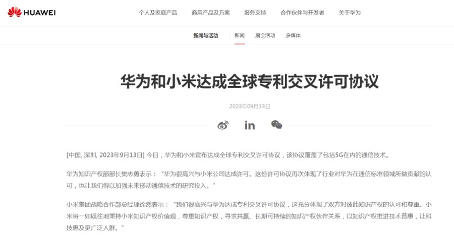 “相杀相爱”,华为和小米宣传达成全球专利交叉许可协议