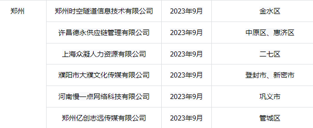 正观新闻记者在抖音公布的“团购配送区域代理商”名单中看到,郑州共有6家代理商入选,分别为郑州时空隧道信息技术有限公司(金水区)、许昌德永供应链管理有限公司(中原区、惠济区)、上海众宁人力资源有限公司(二七区)、濮阳市大濮文化传媒有限公司(登封市、新密市)、河南慢一点网络科技有限公司(巩义市)、郑州亿创志远传媒有限公司(管城区)。