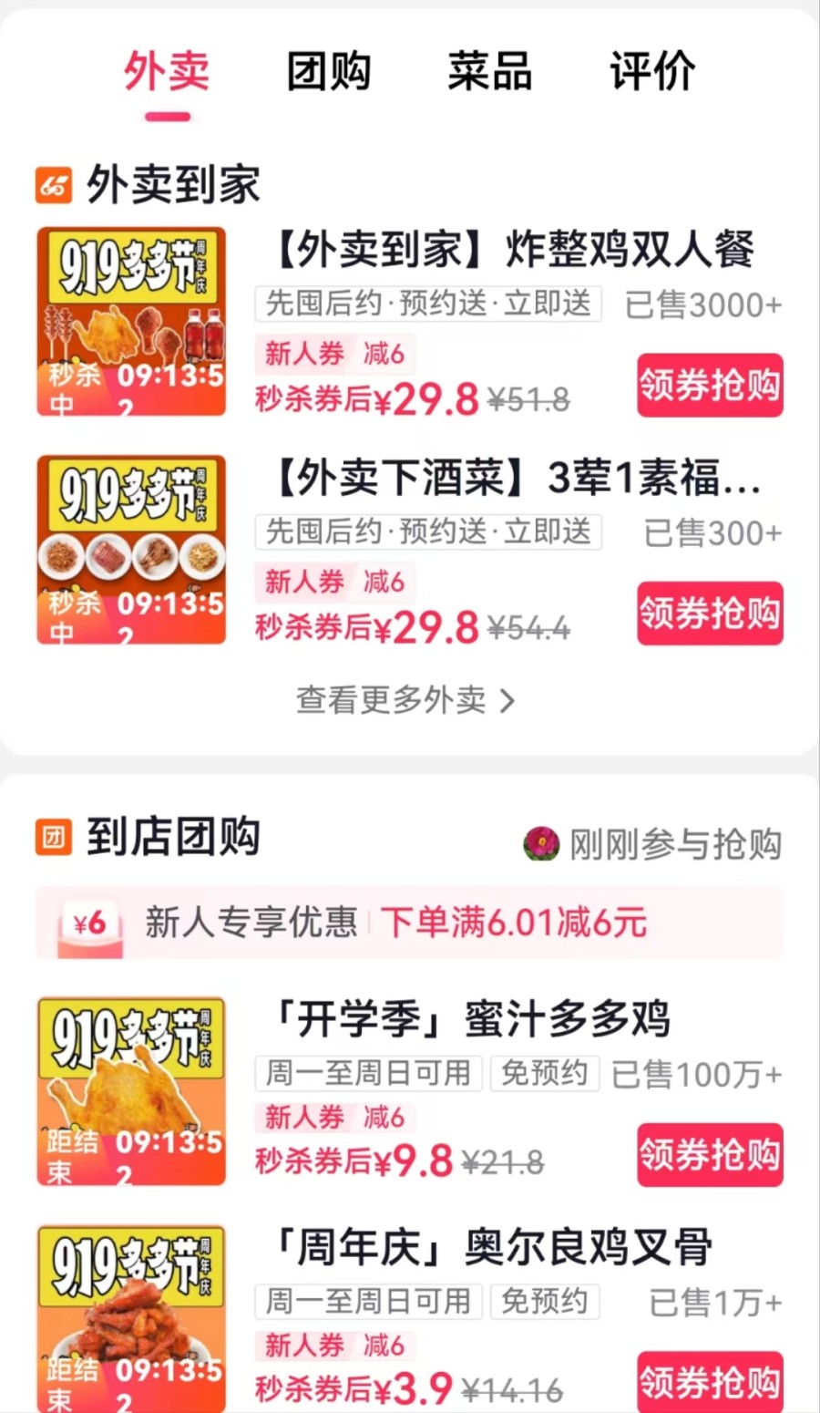 需要指出的是,整体来看,抖音“外卖到家”的品类仍比较少,商家仅提供客单价较高的套餐,美团外卖的可选性会更多,而与其对应的“到店团购”,显然折扣力度更大。以上述门店为例,其“外卖到家”价格从29.8元-113元不等,其中,销量最好的秒杀券后售价29.8元的炸鸡双人餐销量达3000+。“到店团购”多为秒杀券后3.9元、7.8元、9.8元的各类单品,其中售价9.8元的蜜汁多多鸡和2.9元的蒜香炸鸡腿销量均为100W+。