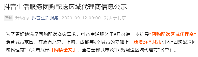 9月12日,抖音生活服务发布《团购配送区域代理商信息公示》。公示显示,为了更好地满足团购配送商家需求,抖音生活服务于9月份进一步扩展“团购配送区域代理商”覆盖城市范围。在原有北京、上海、成都等6个城市的基础上,新增24个城市引入“团购配送区域代理商”(以下简称:区域代理商)。自此,抖音生活服务团购配送业务共在30个城市上线。