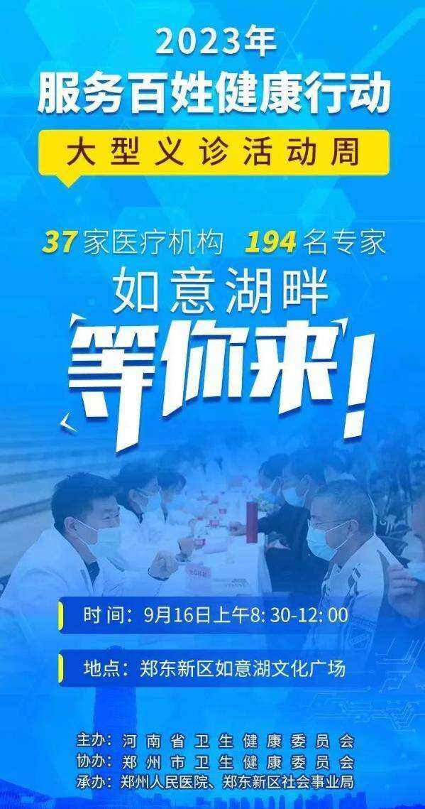 9月14日,记者从河南省卫生健康委获悉,河南将于9月16日在郑东新区如意湖文化广场举行“服务百姓健康行动”大型义诊活动。