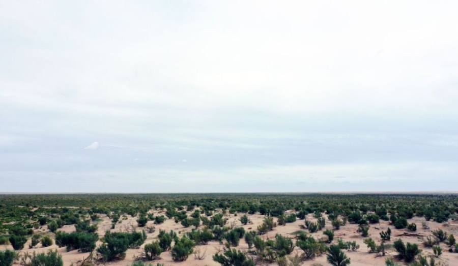 经过封禁保护和人工种植梭梭后恢复绿色的草场(2023年9月12日摄)。