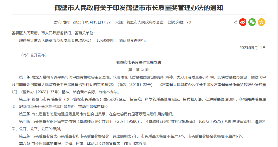 一次性奖励50万元!鹤壁出台市长质量奖管理办法