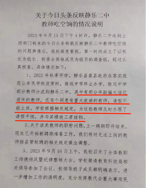 近日,有网友举报,山西静乐二中存在教师吃空饷问题。该校发布情况说明回应称,部分临近退休以及患有重大疾病的教师,在2022年秋季两校合并后办理了请假手续,对这部分教师,学校要求请假到期的马上返校,因病不能返校的要完善手续。